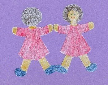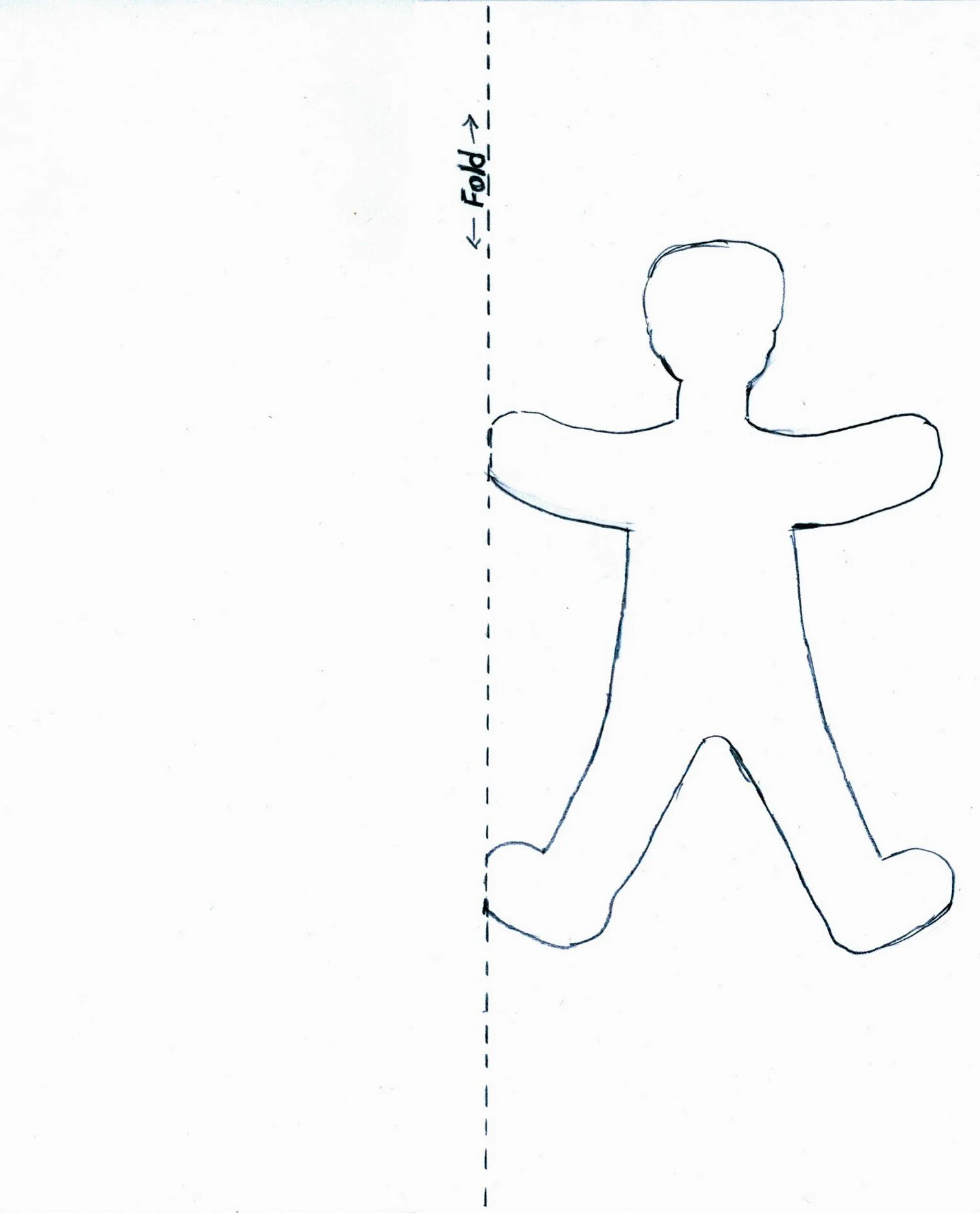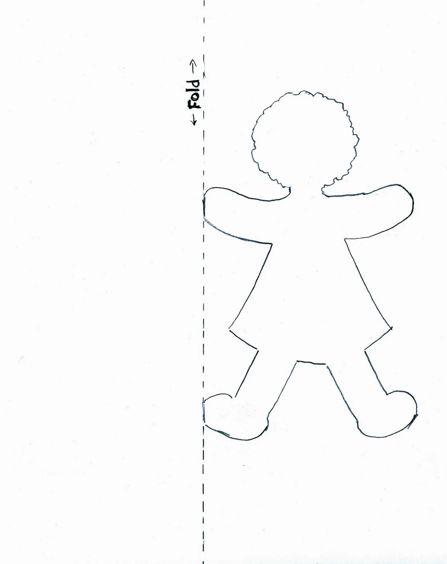 Print out one of the paper doll figures at the end of the text and fold the paper on the dotted line. Cut the figure out, cutting through both sides of the folded paper at once and making sure not to cut the hand and foot where it touches the fold, so that when you unfold the paper you have two figures that look like they are holding hands and have their foot touching. Like this, except they will be blank until you colour them your way: