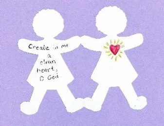 Use a pencil or pencil crayon to draw in a face on the paper person on the right side, and the lines of the clothes. The left side is the back of the paper person, so don’t put a face there. Using the skin-coloured paints or crayons, colour in the face and skin, and use whatever colours you like for the clothes and hair. After you have drawn the back and front of the person on one side, turn it over to see the plain white side. Put a shiny bright heart on one side, and if you want, you can write the words from the psalm around or opposite the heart: “Create in me a clean heart, O God.” You can make a few of these paper people if you want, either using the pattern or drawing your own on a plain piece of paper. Give each one a different skin tone, and give them all different hair styles and clothes. But put a shiny bright heart inside each one, like this, and fold it so the heart is on the inside: