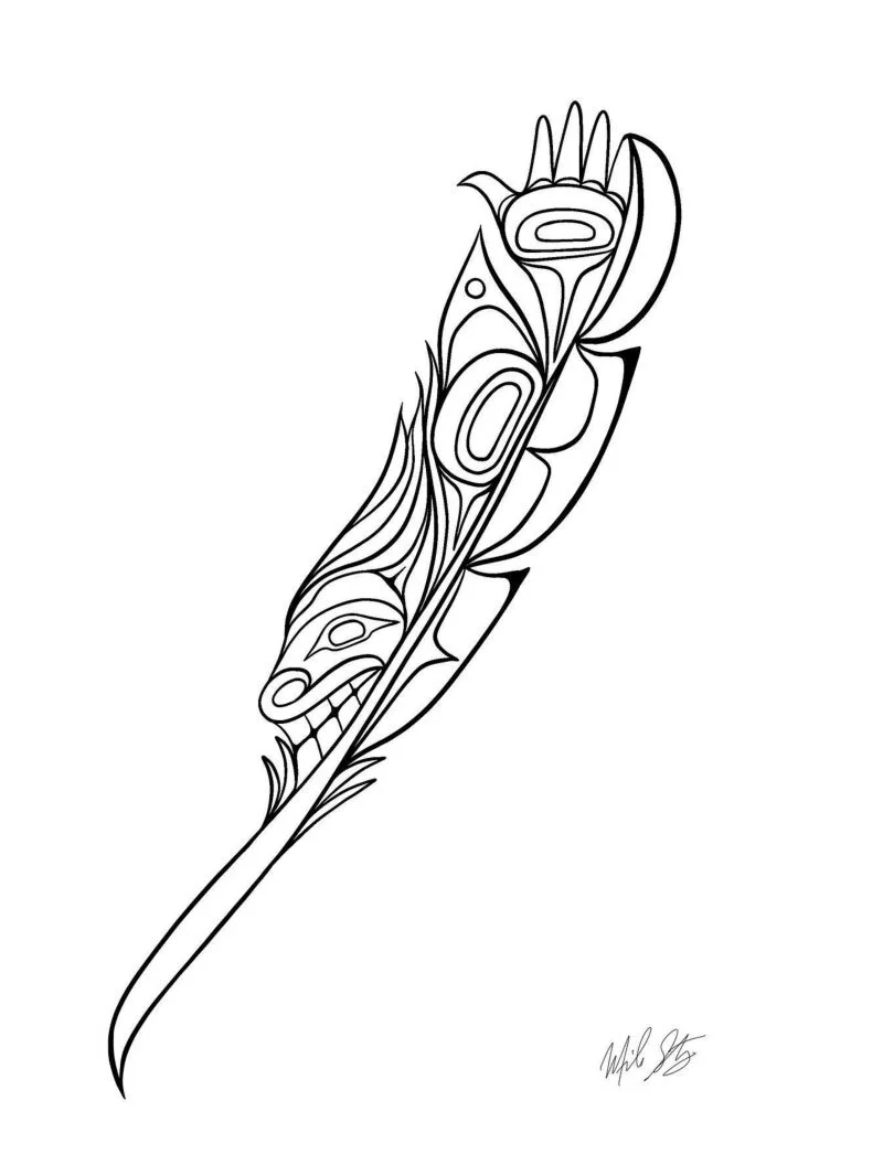 Inside the feather is the spirit of the 215 children. The face on the bottom is not an animal. That is how I draw people , and I wanted to make long flowing hair, that they were forced to cut.”